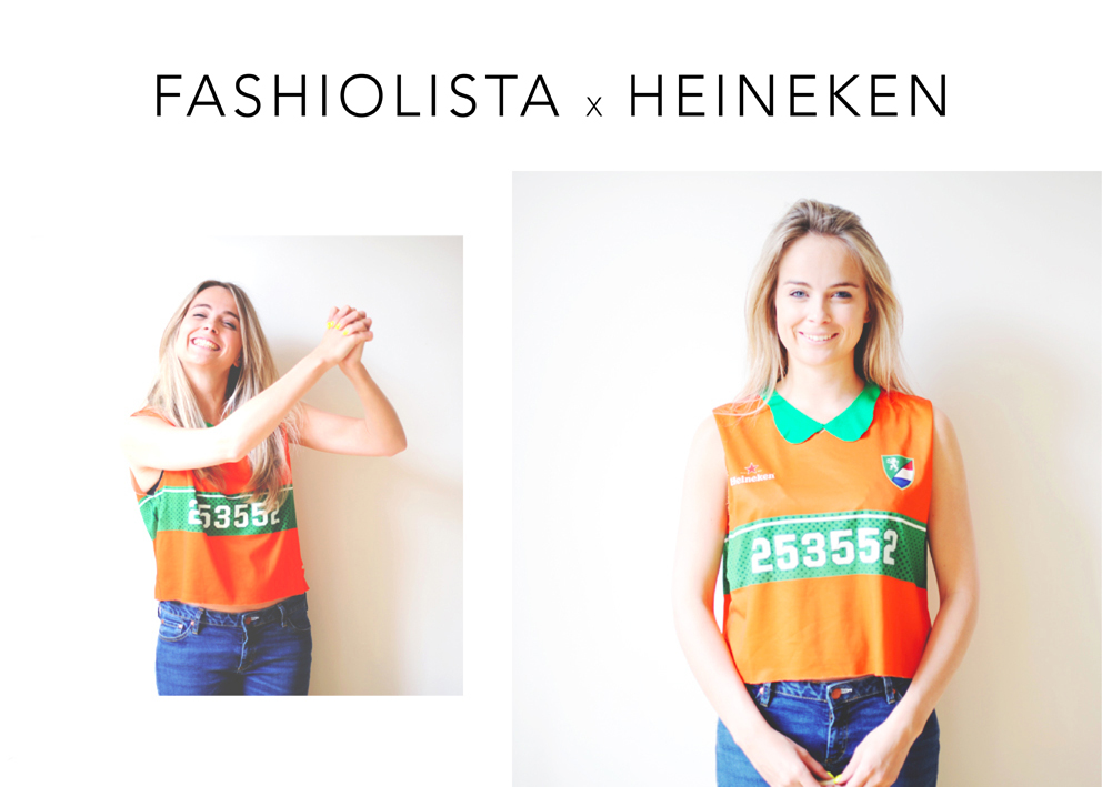 Fashiolista and Heineken put me up for one heck of a challenge, but being a true football fan during any World or European championships, this one was made for me. The challenge: to transform the Heineken rugnummers shirt into a fashionable supporters look. Given the original sizing and coloring of the shirt, some serious "tweaking" had to be done. The result ? A cropped shirt topped off with a peter pan collar, and a huge banner of me on Fashiolista. Do we likey?